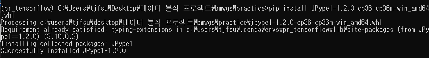 Anaconda prompt에 들어가 pip install JPype1‑1.2.0‑cp36‑cp36m‑win_amd64.whl